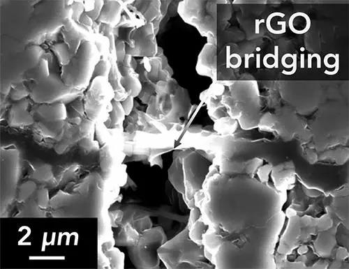 力學(xué)測(cè)試表明,復(fù)合材料的韌性比單純的陶瓷提高了兩倍以上。Athanasiou 說(shuō):“當(dāng)裂紋在材料中開(kāi)始擴(kuò)展時(shí),石墨烯能將裂紋表面固定在一起,這樣裂紋擴(kuò)展就需要更多的能量。”實(shí)驗(yàn)還表明,只要確保在陶瓷中添加的石墨烯是適量的,就不會(huì)影響材料的電學(xué)性質(zhì),同時(shí)又能達(dá)到增韌效果。