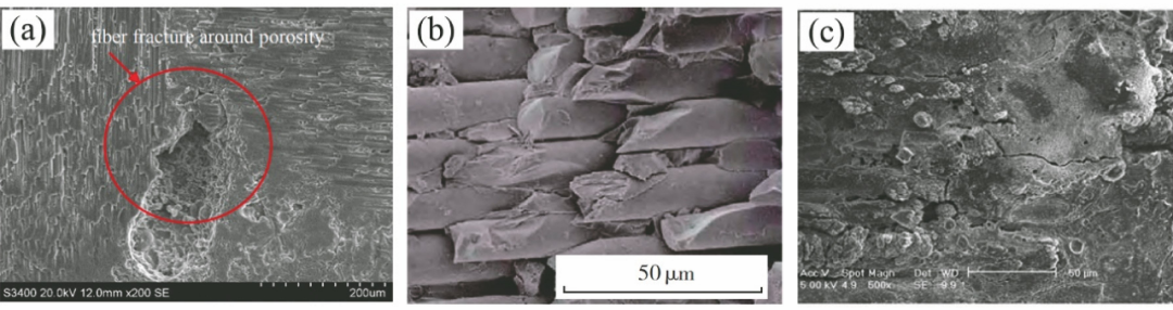 圖6 C/SiC在激光加工中產(chǎn)生的缺陷:(a)纖維斷裂;(b)基體缺失;(c)微裂紋