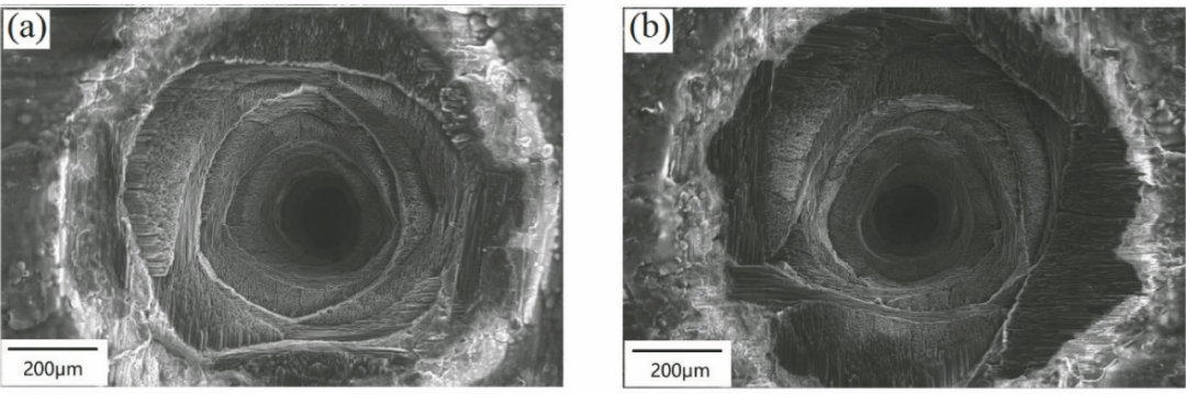 圖3 不同波長激光對纖維增強材料的作用效果對比:(a)紅外激光;(b)紫外激光
