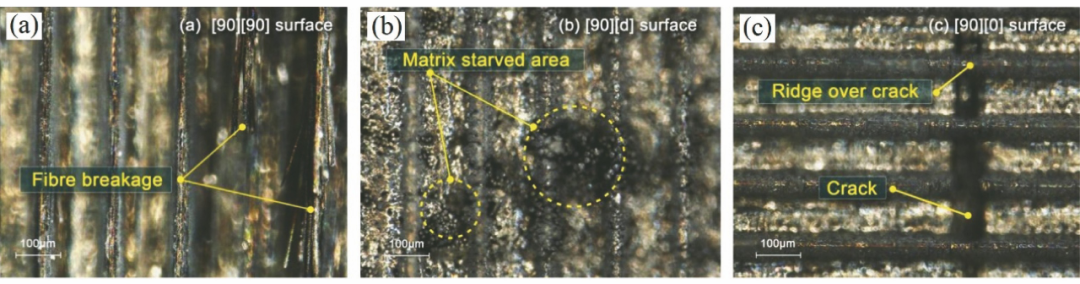 圖1 CMC-SiC在特種加工中產(chǎn)生的缺陷。(a)超聲加工;(b)水射流加工;(c)電火花加工