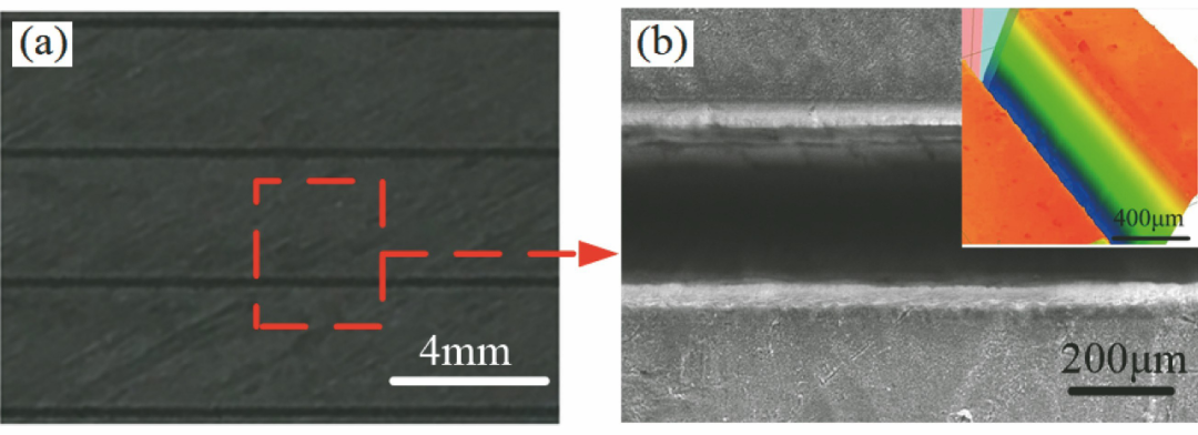 為了控制CMC-SiC中由激光熱作用導致的加工缺陷利用超短脈沖激光對CMC-SiC 進行精密加工成為國內(nèi)外學者研究的熱點。蔡敏等對比了納秒激光和皮秒激光的SiC/SiC加工效果,結(jié)果表明:納秒激光加工過程中材料表面同樣存在熱影響區(qū),導致激光輻照區(qū)域產(chǎn)生了重鑄層、分層及微裂紋等缺陷;利用皮秒激光加工,相對納秒激光,SiC/SiC的加工質(zhì)量有顯著提高,激光輻照區(qū)域未發(fā)現(xiàn)熱影響區(qū),即重鑄層、分層、微裂紋等缺陷在皮秒激光加工中得到了有效抑制。Liu等利用皮秒激光開展了C/SiC的微孔加工實驗,研究發(fā)現(xiàn):當激光功率密度較低時,孔內(nèi)形成的反沖氣壓同樣較低,導致孔內(nèi)碎屑不能有效噴出;升高激光功率密度后,加工過程中孔內(nèi)產(chǎn)生強烈的沖擊波,形成的反沖高壓使得碎屑從孔內(nèi)高速向外噴射,微孔加工質(zhì)量明顯提高。Moreno等開展了飛秒激光加工纖維增強復合材料的實驗研究,發(fā)現(xiàn)內(nèi)部基體材料的尺寸和形狀對激光加工質(zhì)量存在較大影響。在飛秒激光參數(shù)的合理調(diào)控下,纖維增強復合材料獲得了良好的加工質(zhì)量。Zhai等在SiC/SiC上利用飛秒激光進行了多種微結(jié)構的制備研究,檢測報告顯示SiC/SiC加工區(qū)域輪廓清晰,沒有出現(xiàn)機械加工常見的崩邊、纖維拔出,以及長脈沖激光加工中明顯的熱影響區(qū)。為了驗證加工效果,利用飛秒激光在SiC/SiC表面制備了大面積的微槽結(jié)構,加工效果如圖8所示。
